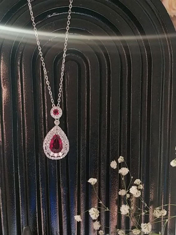 گردنبند و پلاک جواهری دارای سنگ مصنوعی قرمز پلاک به صورت مربع و دور تا دور سنگ نگین کاری شده جنس استیل و با دوام مناسب جشنها و مهمانیها