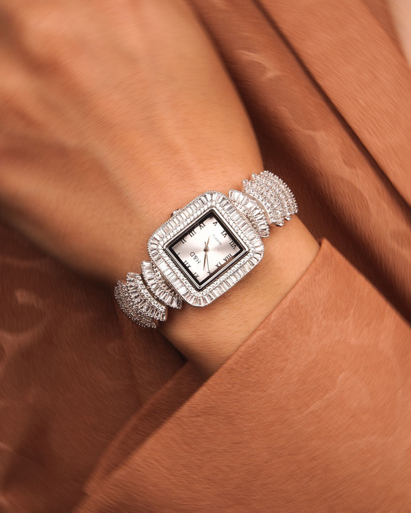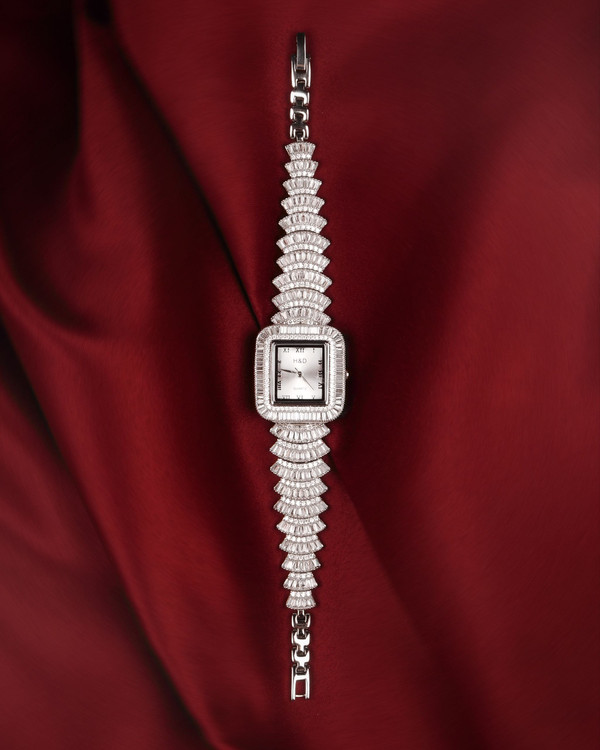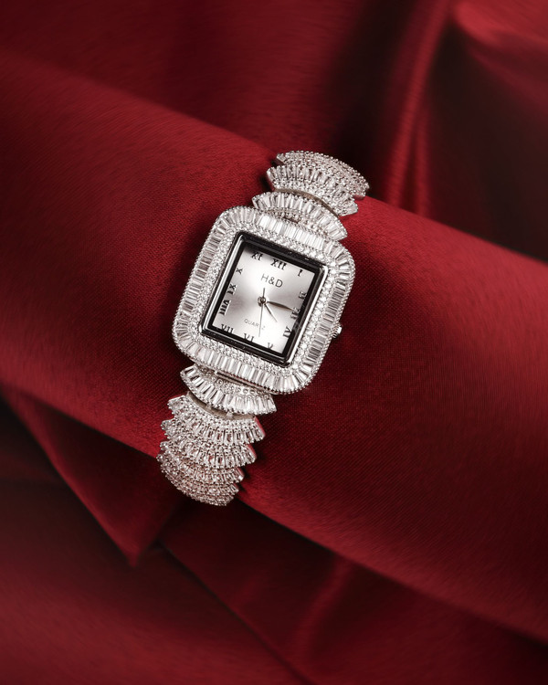 ساعت نقره جواهری برند H&D کد W2صفحه سفید دارای موتور ژاپن با دوسال گارانتی یکی از ساعتهای زیبای مجموعه نیک سیلور است نگینهای این ساعت زیبا زیرکونیا و باگت میباشد این ساعت دارای بند تنظیم و قفل کتابی محکم است برای درخشش و جلای کار آبکاری رودیوم انجام شده است که بدون حساسیت است