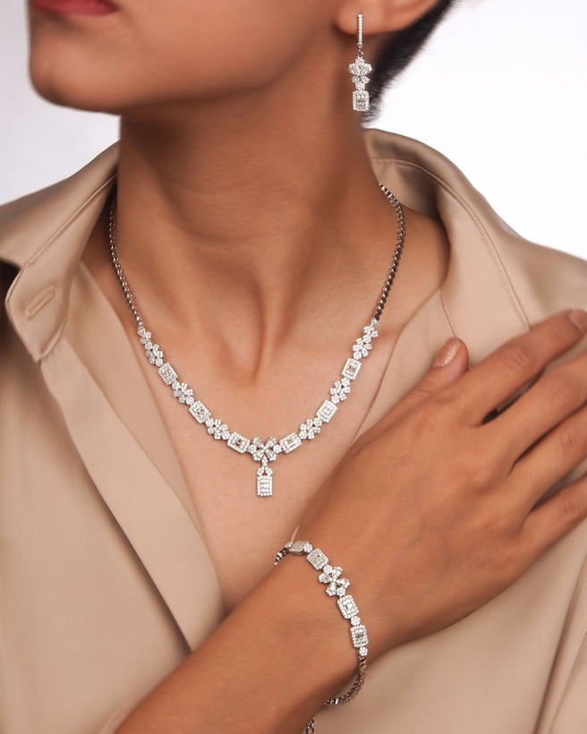 سرویس زنانه نقره جواهری امرالدکات کد S4 یکی از زیباترین و پرطرفدارترین سرویس های نقره مجلسی است.این محصول با رادیوم آبکاری شده تا درخشش و ماندگاری بالایی داشته باشد و همچنین بدون حساسیت باشد.وزن کار 32 گرم است و با فاکتور ارائه میگردد این کار خاص و زیبا به عنوان سرویس عروس بسیار مورد پسند است و همچنین استایل شما را در جشنها و مهمانیها تکمیل میکند و باعث میشود در هر جمعی بدرخشید