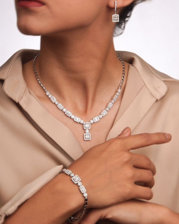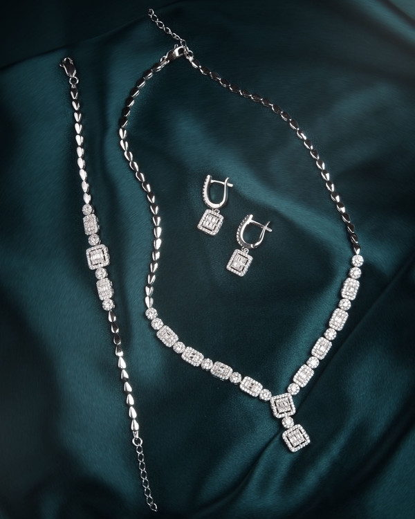 سرویس زنانه نقره جواهری امرالدکات کد S5 یکی از زیباترین و پرطرفدارترین سرویس های نقره مجلسی است.این محصول با رادیوم آبکاری شده تا درخشش و ماندگاری بالایی داشته باشد و همچنین بدون حساسیت باشد.وزن کار 36 گرم است و با فاکتور ارائه میگردد این کار خاص و زیبا به عنوان سرویس عروس بسیار مورد پسند است و همچنین استایل شما را در جشنها و مهمانیها تکمیل میکند و باعث میشود در هر جمعی بدرخشید