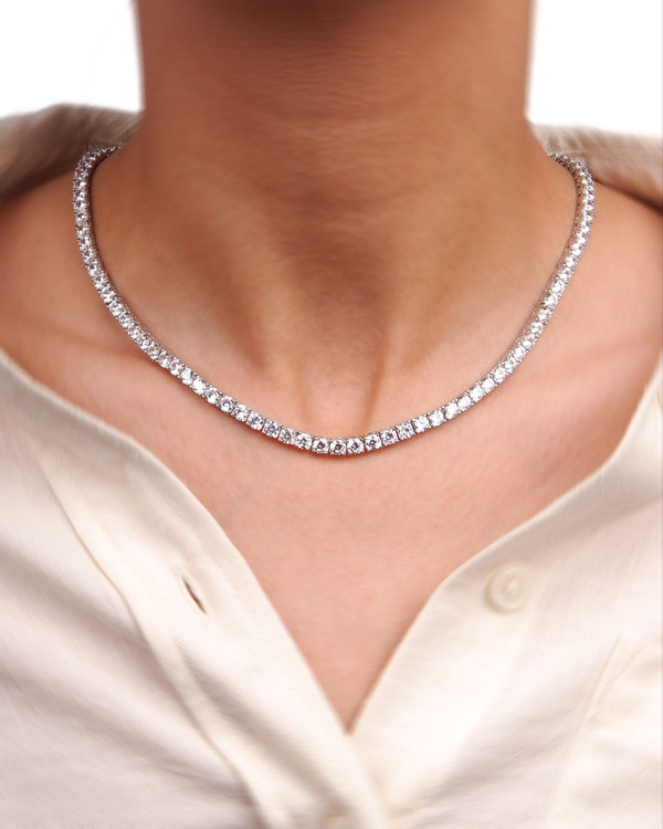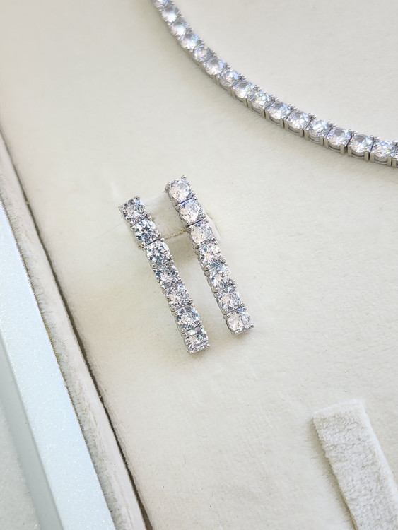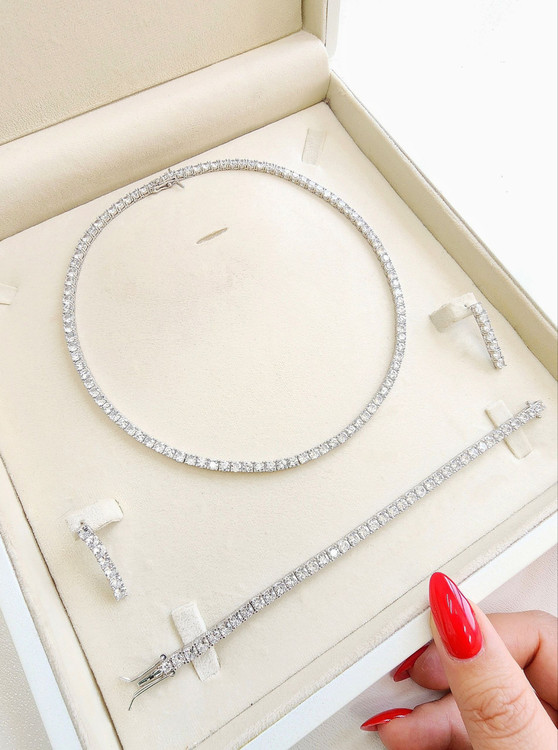 اگر بهدنبال یک سرویس نقره خاص، شیک و درخشان برای استفاده روزمره یا مجالس هستید، این سرویس نقره زنانه مدل تنیسی انتخابی بینظیر خواهد بود. طراحی این سرویس به سبک تنیسی کلاسیک انجام شده است و نگینهای درخشان 4 میلیمتری با دقت بالا در کنار هم چیده شدهاند تا جلوهای درخشان و یکنواخت ایجاد کنند.
