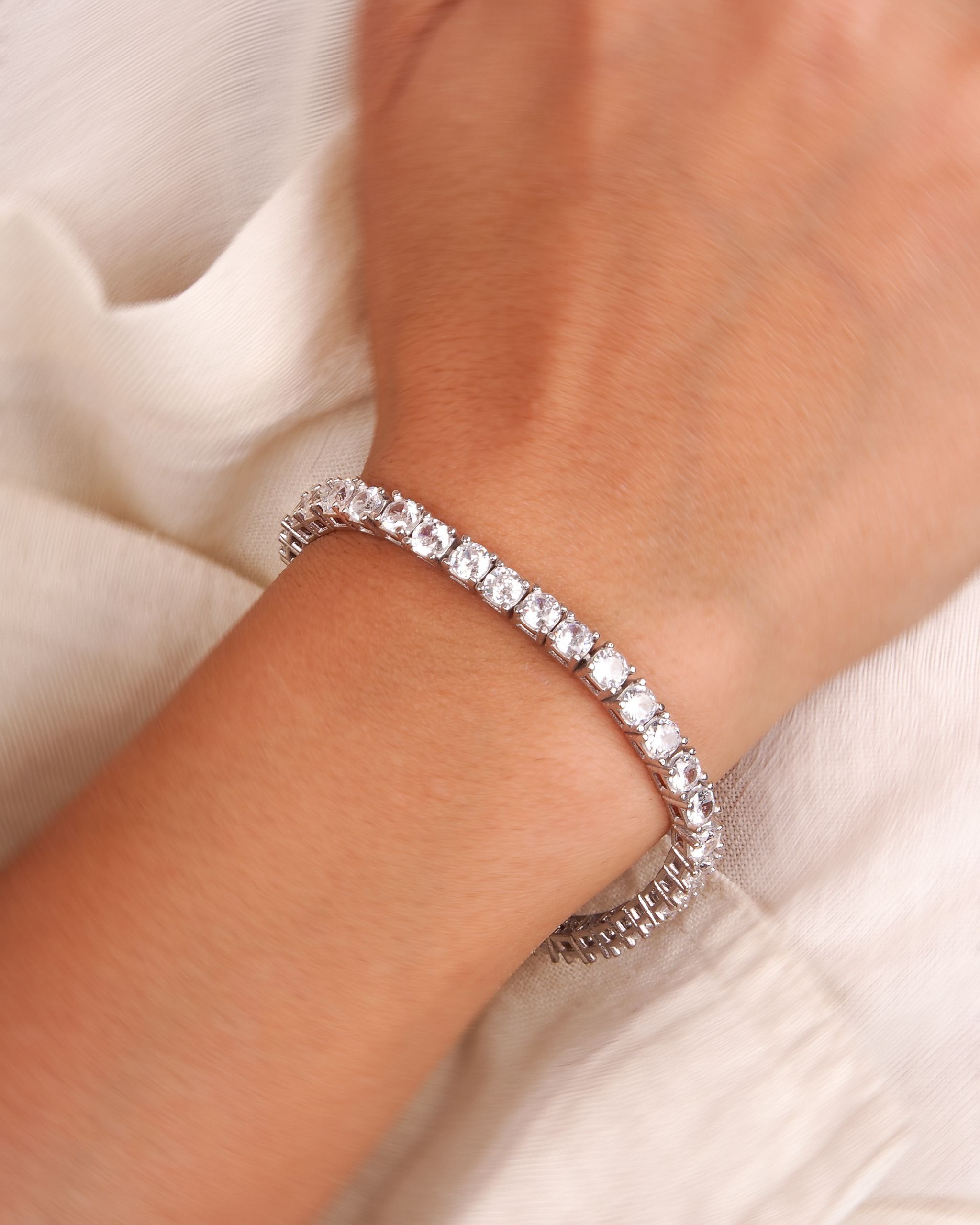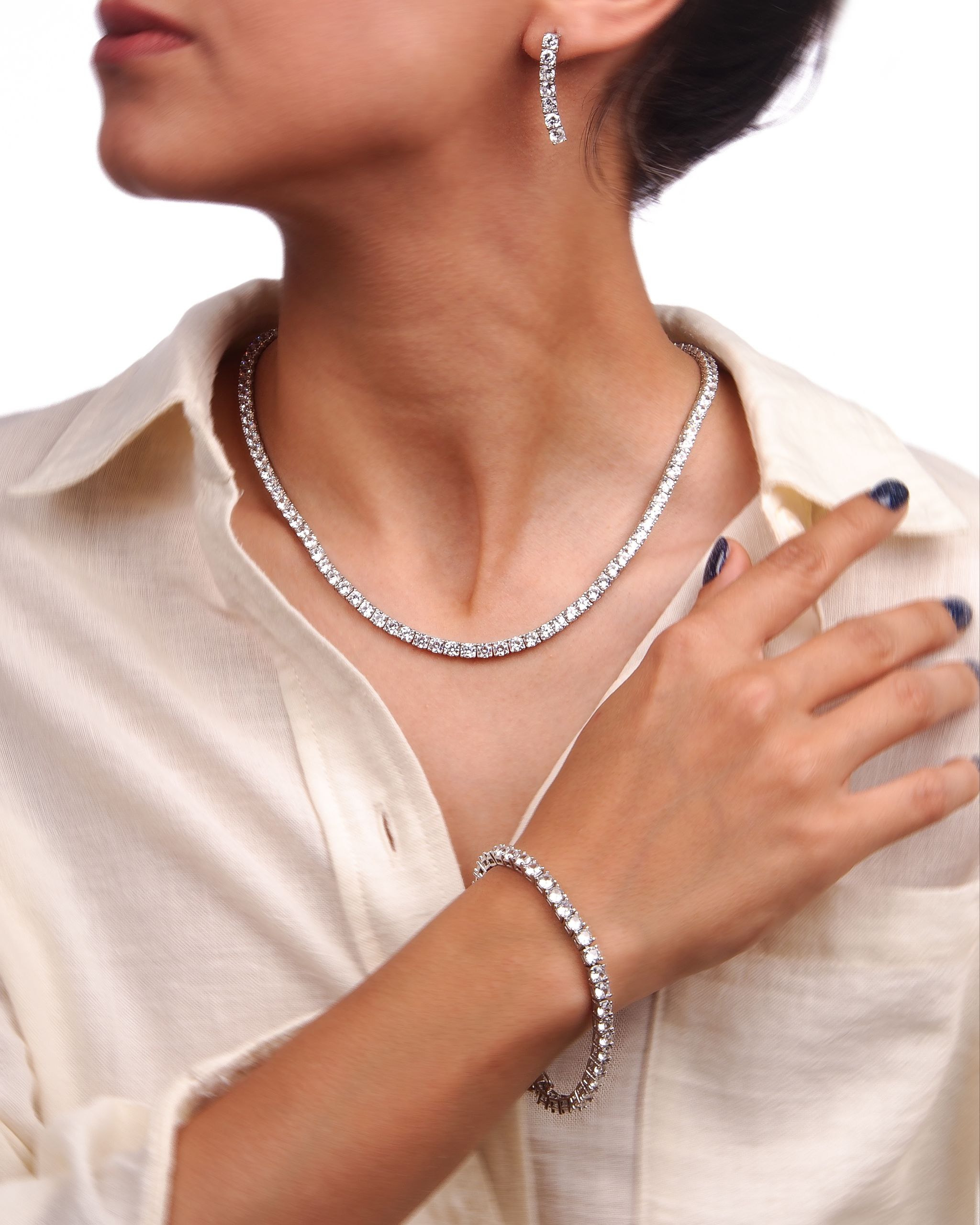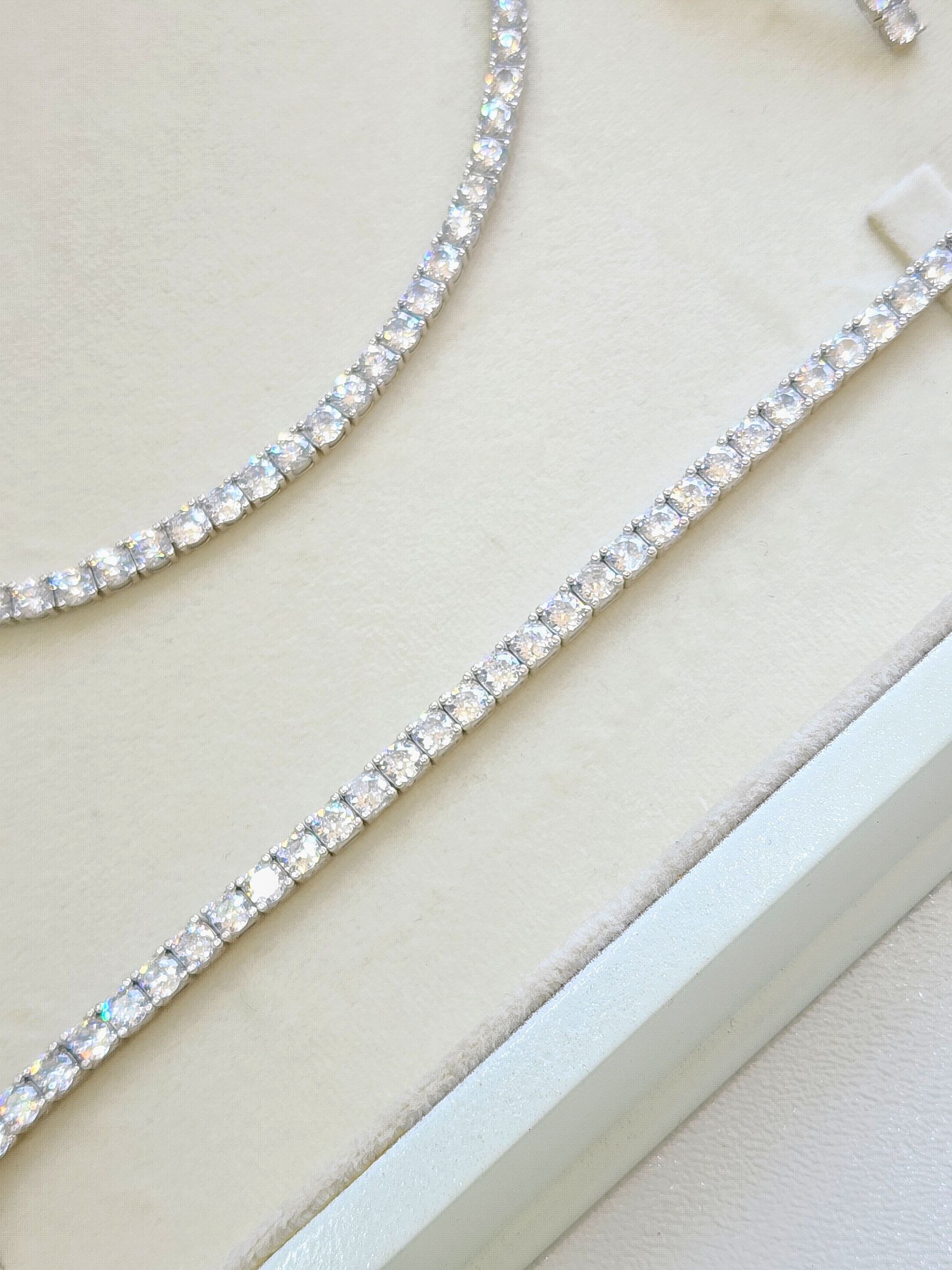 اگر بهدنبال یک سرویس نقره خاص، شیک و درخشان برای استفاده روزمره یا مجالس هستید، این سرویس نقره زنانه مدل تنیسی انتخابی بینظیر خواهد بود. طراحی این سرویس به سبک تنیسی کلاسیک انجام شده است و نگینهای درخشان 4 میلیمتری با دقت بالا در کنار هم چیده شدهاند تا جلوهای درخشان و یکنواخت ایجاد کنند.