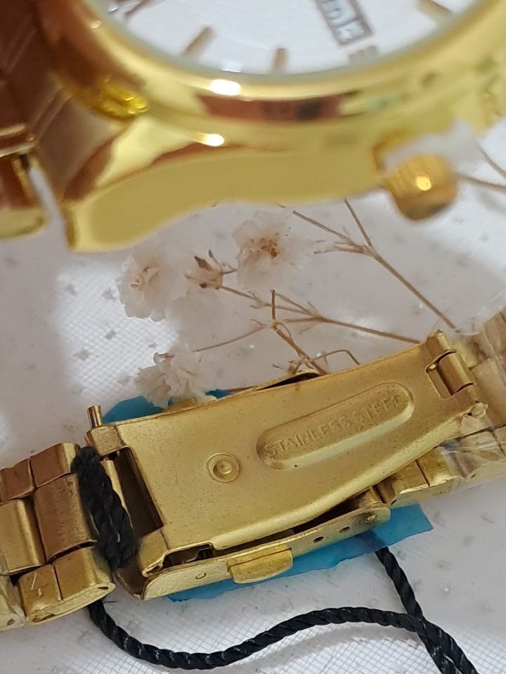 بند استیل ضد زنگ با روکش طلایی نه تنها ظاهری لوکس دارد بلکه مقاومت بالایی در برابر خوردگی و سایش نیز دارد. صفحه سفید این ساعت مچی با جزئیات طلایی، هماهنگی زیبایی با بند طلایی ایجاد کرده و ظاهری کلاسیک و همزمان مدرن به ساعت میبخشد.