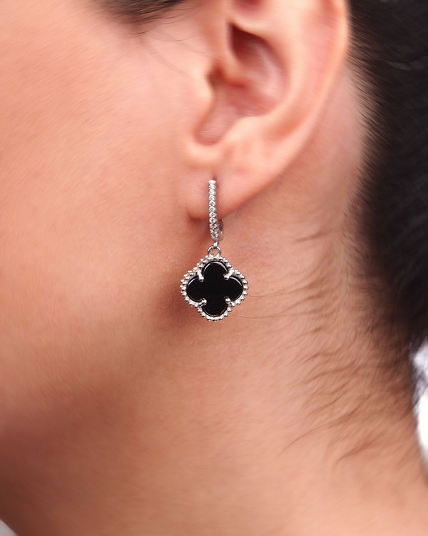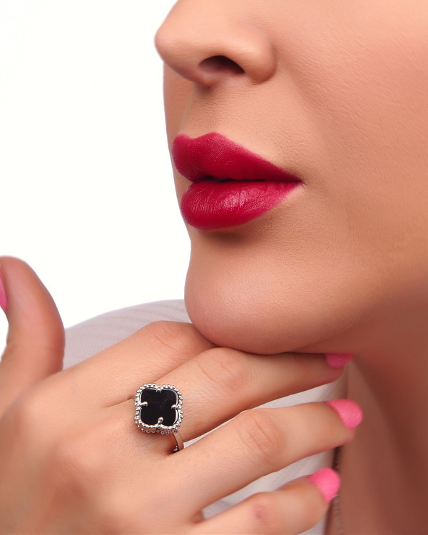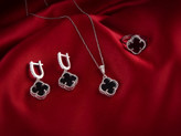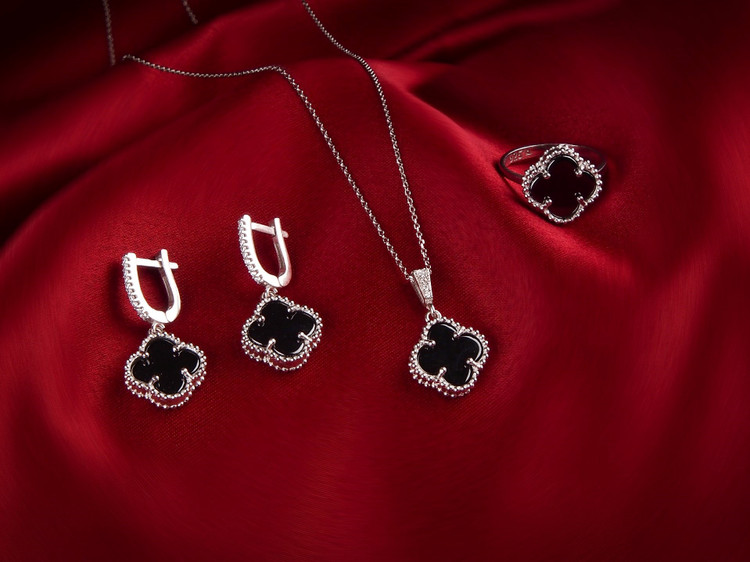 نیمست ونکلیف نقره سنگ مشکی مدل تک گل از جنس نقره 925 با آبکاری درجه یک رودیوم ساخته شده از قالب طلا شامل یک جفت گوشواره با قفل کلیپسی یک پلاک و انگشتر است.سنگ بکار رفته در این نیمست از نوع صنعتی مرغوب می باشد که درخشش خاصی به این نیمست زیبا داده است طرح ونکلیف یکی از پرطرفدارترین زیورآلات در جهان است که مدل نقره این طرح بدلیل قیمت پایین و ارزش اقتصادی آن بسیار مورد توجه است