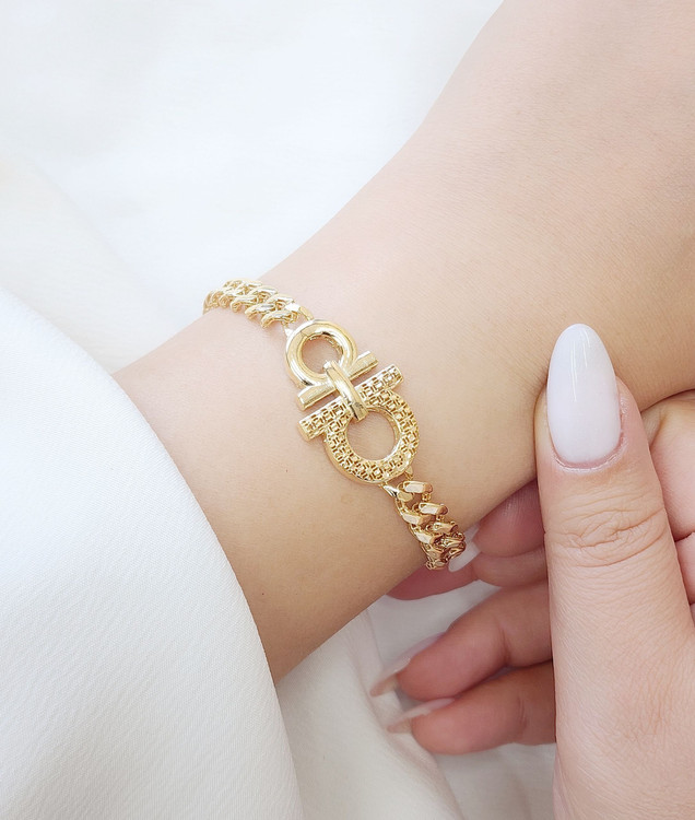 دستبند فیوژن نقره کد D11 و آبکاری دورنگ سفید و طلایی ملی زیبا و جدید از گالری نیک سیلور است زنجیر دستبند به شکل کارتیر است و طرح روی کار نیز دارای تراش می باشد