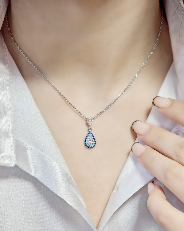 پلاک چشم نظر نقره مدل اشک مدلی جذاب از گالری نیک سیلور با آبکاری درجه یک رودیوم و نگینهای درخشان برلیان اتمی و سنگهای تزیینی درجه یک و بدون ریزش است این پلاک زیبا مخصوص استفاده روزمره ویا جشنها و مهمانیهای شماست