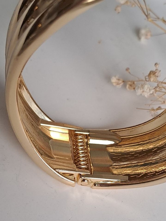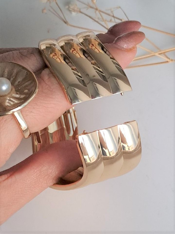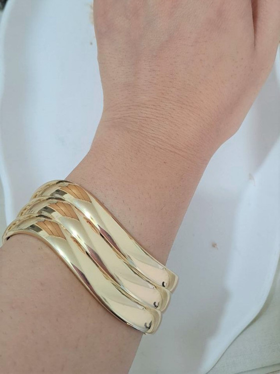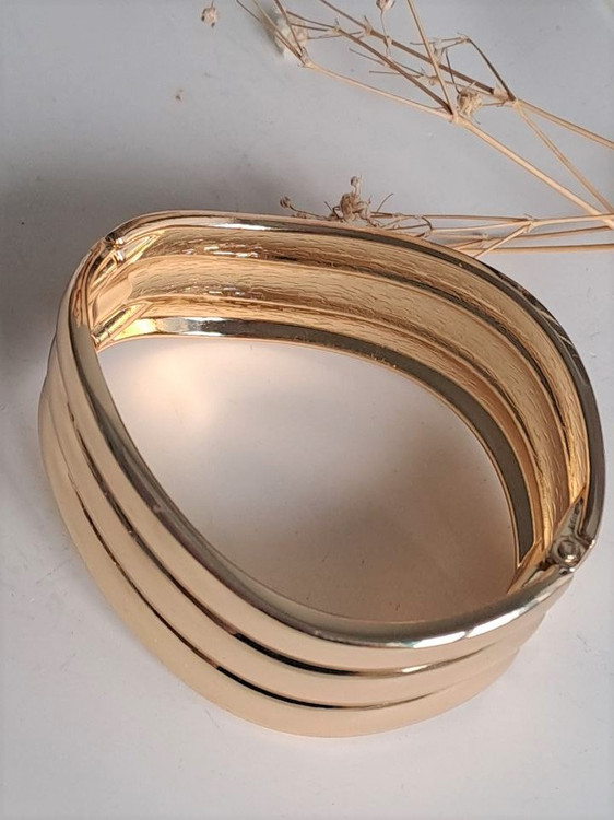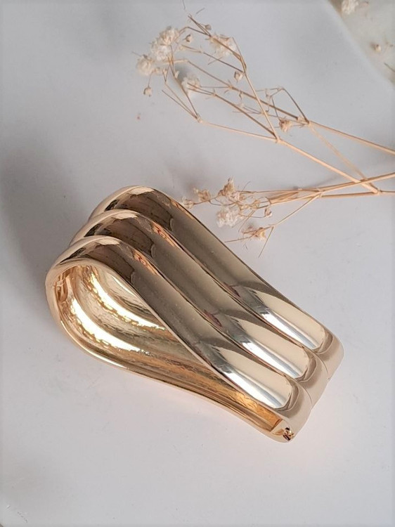 بنگل فشن آبکاری طرح موج طلایی یکی از زیباترین بنگل های گالری نیک سیلور است این بنگل زیبا با آبکاری طلایی درجه یک کیفیت عالی مدلی جذاب برای مهمانیها و دورهمیهای شماست .
