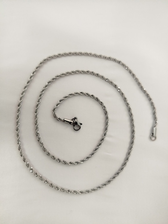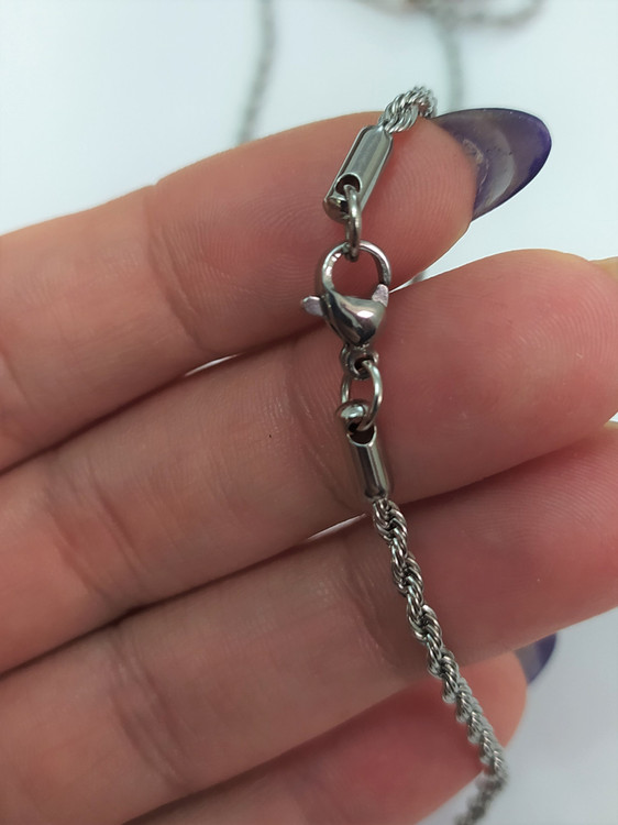 زنجیر مردانه استیل طنابی به صورت بلند می باشد و طول آن برابر با 60 سانتی متر است که در انتهای آن قفل پروانه ای وجود دارد.