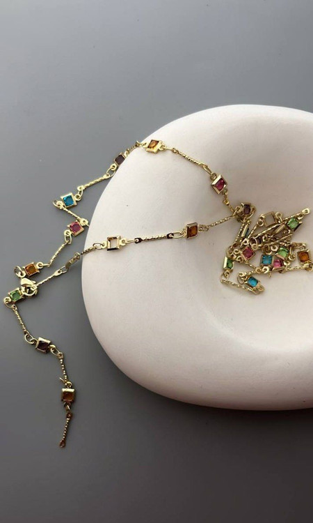 گردنبند مدل وی ، طرح مولتی کالر با جنس کوپر و چندلایه آبکاری و نگین های تزیینی کریستالهای چند رنگ یکی از جدیدترین و خاص ترین مدل های رولباسی است که میتوان آن را به عنوان گردنبند دولاین هم استایل کرد