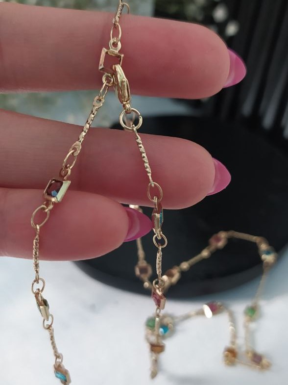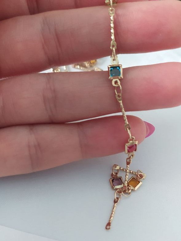گردنبند مدل وی ، طرح مولتی کالر با جنس کوپر و چندلایه آبکاری و نگین های تزیینی کریستالهای چند رنگ یکی از جدیدترین و خاص ترین مدل های رولباسی است که میتوان آن را به عنوان گردنبند دولاین هم استایل کرد