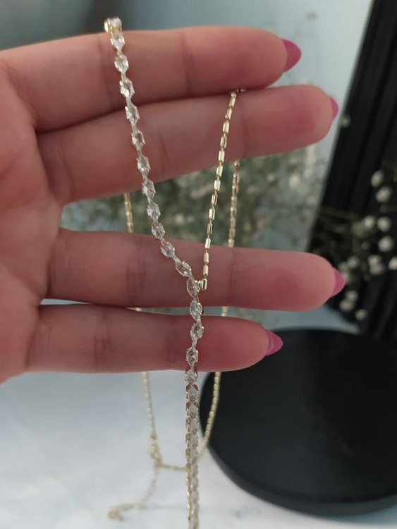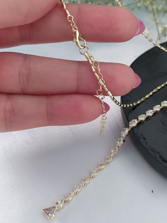 گردنبند مدل V جواهری یکی از مدلهای زیبای گالری نیک سیلور است این مدل زیبا در یک طرف زنجیر و در طرف دیگر جواهری و مدل تنیسی است رنگ کار طلایی و جنس کار کوپر میباشد