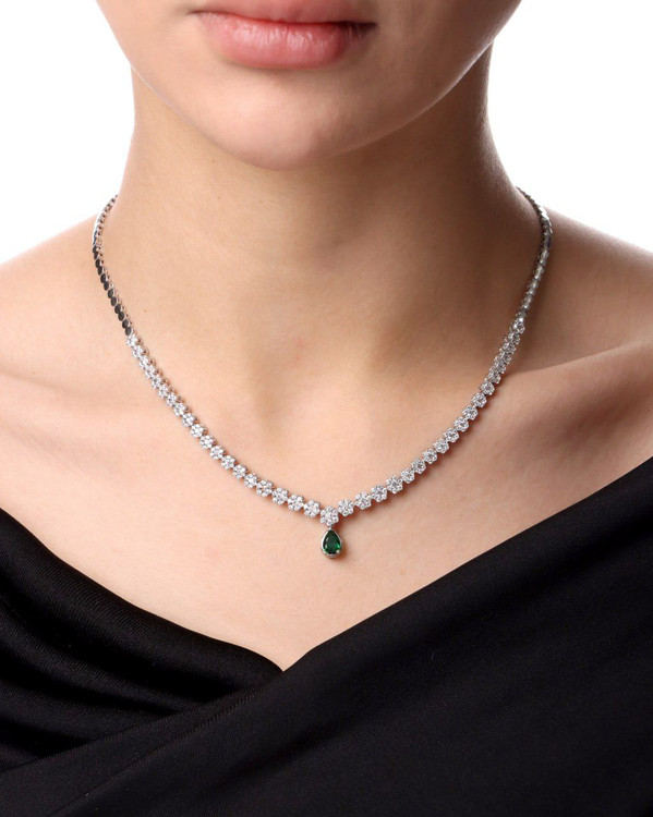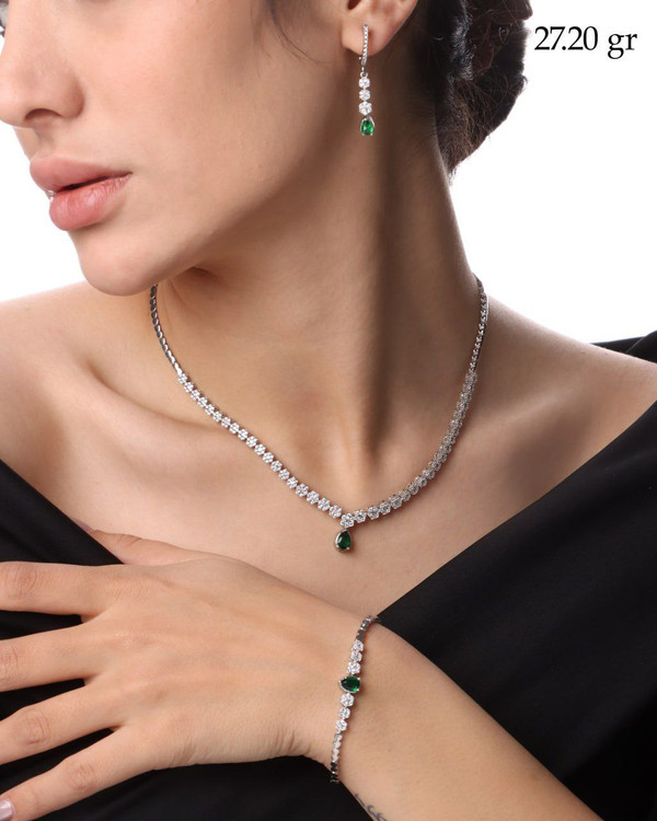 سرویس نقره جواهری زنانه طرح فلاور کد S14 یکی از زیباترین و پرطرفدارترین سرویس های نقره مجلسی است.این محصول با رادیوم آبکاری شده تا درخشش و ماندگاری بالایی داشته باشد و همچنین بدون حساسیت باشد.نگینهای زیرکونیا وسنگ زمرد صنعتی درجه یک بکار رفته در این محصول درخشش بی نظیری به این کار داده است این کار خاص و زیبا به عنوان سرویس عروس بسیار مورد پسند است و همچنین استایل شما را در جشنها و مهمانیها تکمیل میکند و باعث میشود در هر جمعی بدرخشید