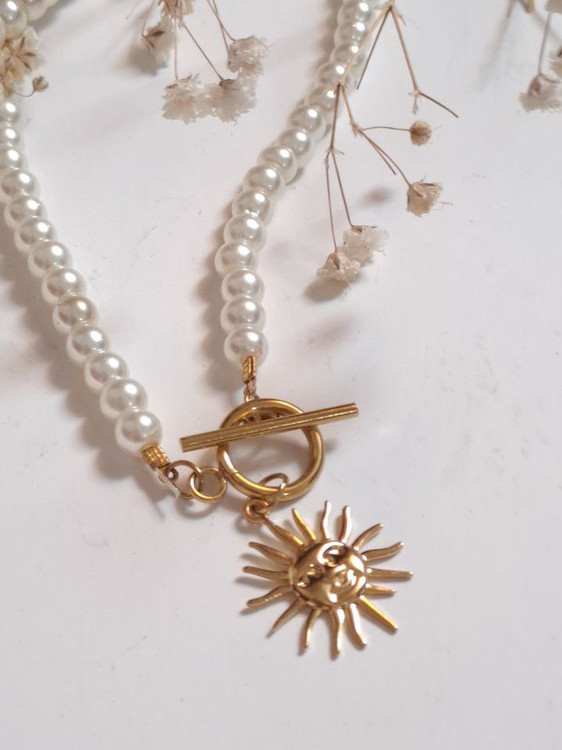 گردنبند مرواریدی طرح خورشید با قفل تی جنس مروارید درجه یک بدون رنگ پریدگی طول گردنبند45 سانت
