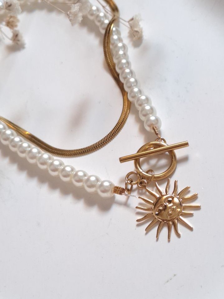 گردنبند مرواریدی طرح خورشید با قفل تی جنس مروارید درجه یک بدون رنگ پریدگی طول گردنبند45 سانت